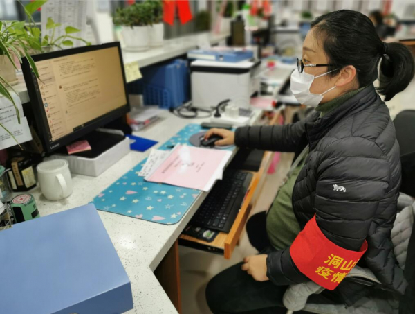 2020年春节伊始,一场没有硝烟的战疫突然打响。年初一晚上洞山街道便发出通知,第二天街道、社区工作人员全员返岗。安排工作人员24小时值班在岗;对辖区居民人口逐户一一排查;对小区所有出入口设立监控点,对人员车辆进行监督登记;发放居民告知书、倡议书……一系列工作紧锣密鼓的开展起来。在所有工作人员中有一位普通又特殊的工作者——王静,怀胎七月的她也毅然和“战友们”一起,站到了防疫第一线。