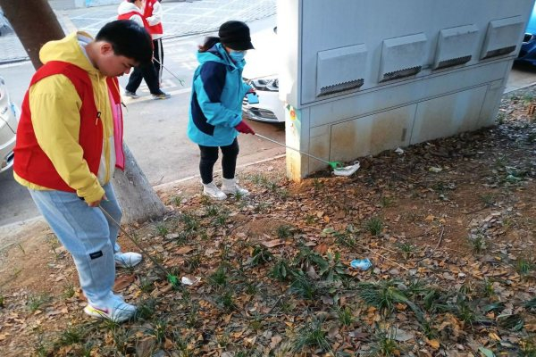 活动中,学生们穿着统一的社区志愿者服装,在社区网格员的带领下来到山水居小区,开展义务劳动活动。大家以不怕脏、不怕累的精神,认真地捡拾绿化带及路面的垃圾、清除楼道内的小广告。