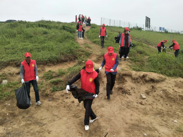 此次活动,志愿者们身穿志愿者红色马甲,头戴志愿者小红帽,拿着垃圾袋沿着淮河饮水保护区岸边拾捡垃圾。